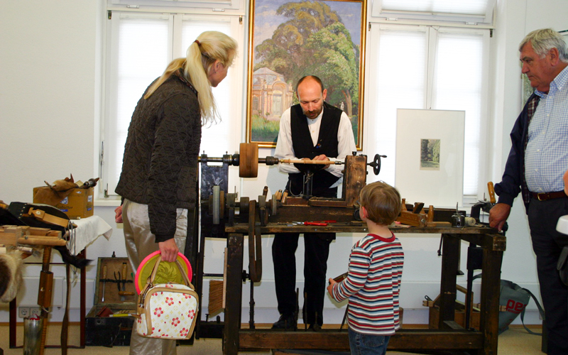 Der Freundeskreis Schwetzinger Museum (FSM) e. V. engagiert sich in den Bereichen Museumspädagogik und Öffentlichkeitsarbeit. So auch bei der Unterstützung von Museumsfesten anlässlich des jährlich stattfindenden Internationalen Museumstages. Beim 2. Museumsfest im Mai 2006 führte Martin Keßler das Arbeiten an einer historischen Drechselbank vor. Foto: Andreas Moosbrugger.